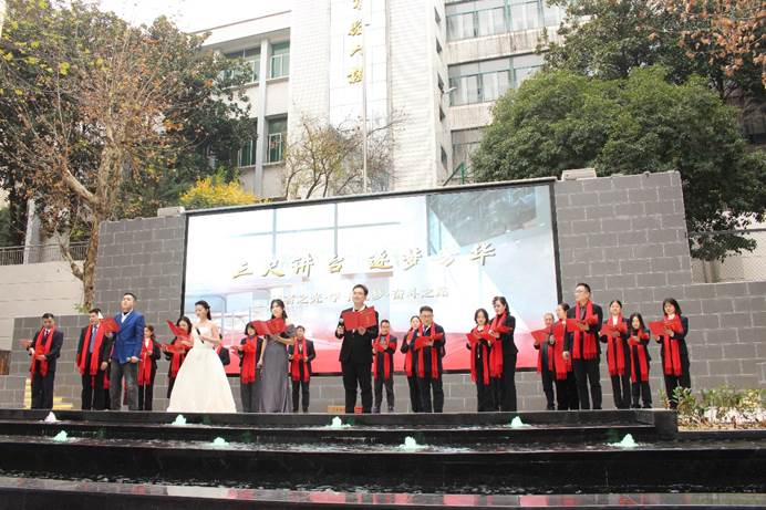校长杨昊带领罗威、肖龙洋、黄凯等校领导帅气出场,带来歌曲《中国人》。激昂的旋律、铿锵有力的演唱,唱出了每一位中国人的骄傲与担当,也激发了三中学子的家国情怀,现场观众纷纷跟唱,爱国之情在歌声中久久回荡。