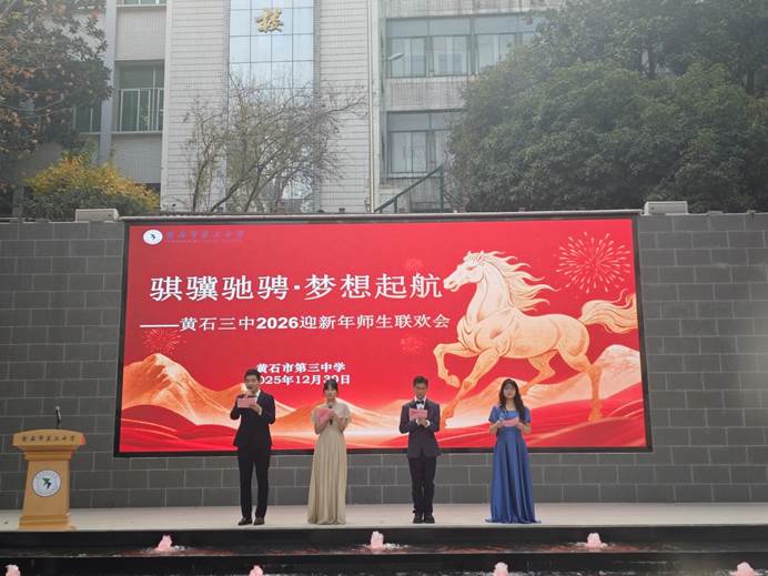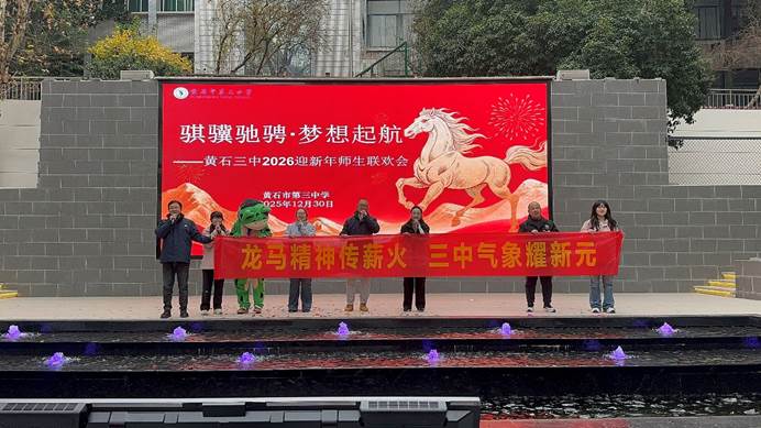 辞旧迎新岁,歌舞庆新春。12月30日下午,“骐骥驰骋 梦想起航”——黄石三中2026迎新年师生联欢会在校园酬勤广场隆重举行。校党委书记周燕霞、校长杨昊等领导与全体师生齐聚一堂,用歌曲、舞蹈、戏曲、朗诵等丰富多样的节目形式,共同告别过往、喜迎新年,定格下师生同心、逐梦前行的温馨瞬间。