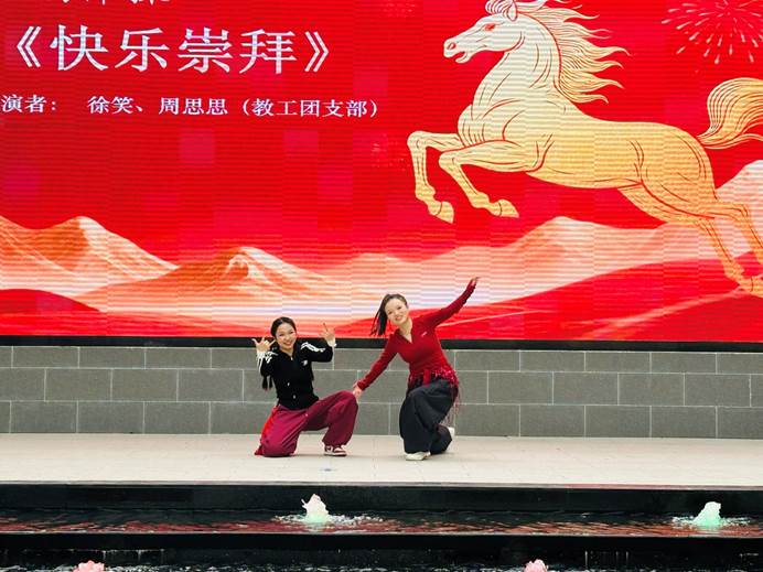 教工团支部的老师们化身“活力担当”,带来韵律操《快乐崇拜》。整齐划一的动作、昂扬向上的姿态,展现了师者们永葆青春的风采,打破了课堂上的严肃形象,让同学们看到了老师们活泼亲切的一面,赢得了全场阵阵掌声。