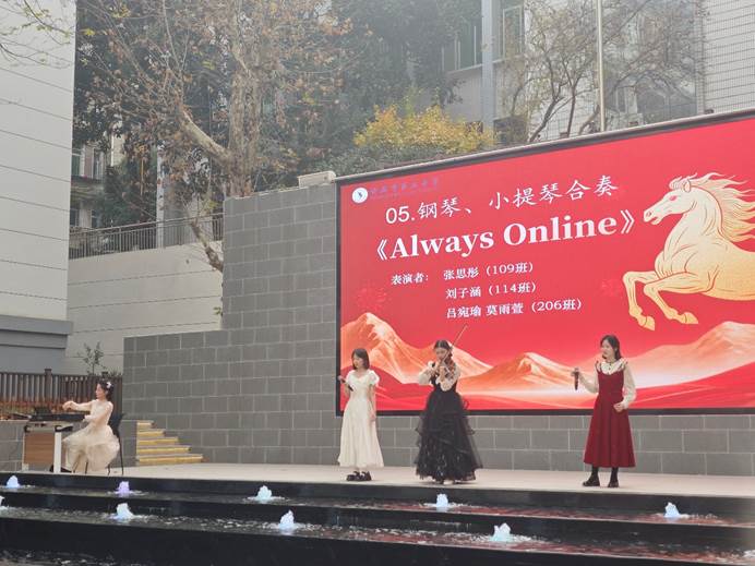 高一(9)班、高一(14)班、高二(6)班的演唱者们携手带来歌曲《Always Online》。温柔的旋律搭配真挚的演唱,传递出追梦路上始终相伴的温暖与坚守,这份跨越班级的默契合作,让现场观众沉浸在这份纯粹的情感之中,感受到了陪伴的力量。