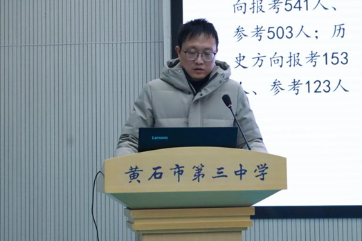 副校长罗威首先对本次联考数据进行了全面、细致的分析。他通过详实的数据对比,指出在参考率保持稳定的基础上,学校一本上线人数较去年9月有所增加,完成率提升,体现了前期复习的积极成效。同时,他精准指出了当前存在的挑战:本科上线人数有所波动,部分班级、学科发展不均衡等问题。他强调,要充分利用数据分析结果,实现从“整体把握”到“精准到班、到人、到知识点”的精细化教学管理。