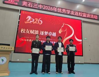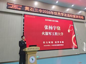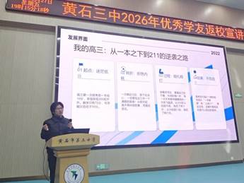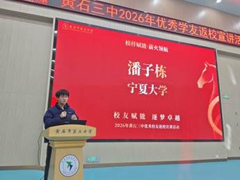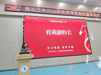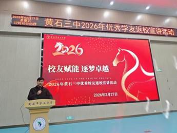 厚植人文底蕴,凝聚榜样力量。2026年2月27日,黄石三中优秀校友返校宣讲活动顺利举行,五位优秀校友重返母校,为高三学子带来备考与成长的干货分享,以经验传承为高考冲刺注入奋进力量。本次活动由学校德体卫艺处刘成洪副主任主持,程莉副校长出席并致辞。