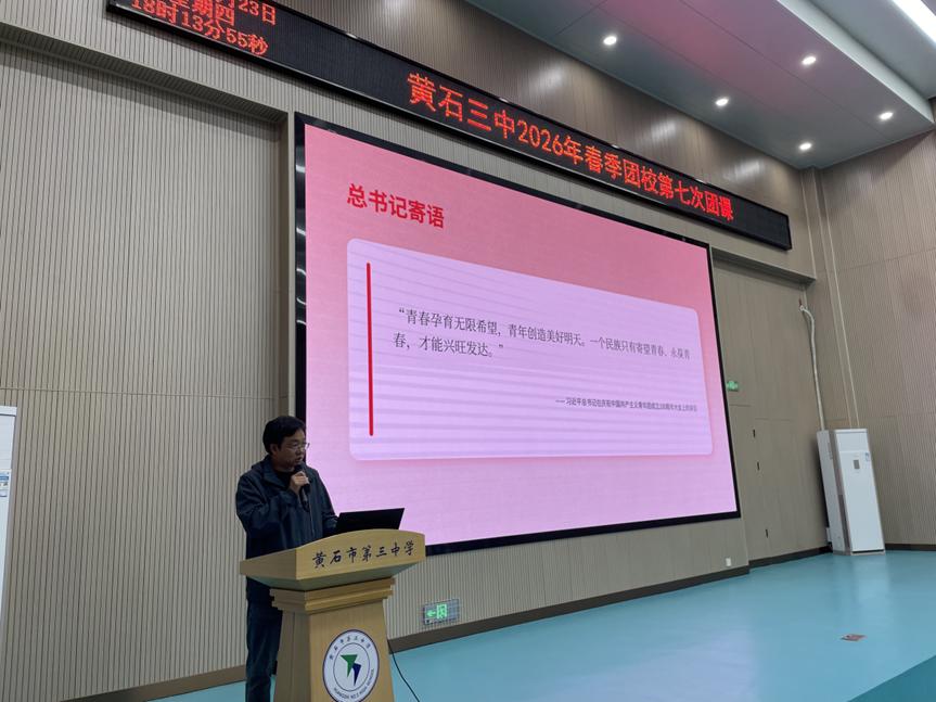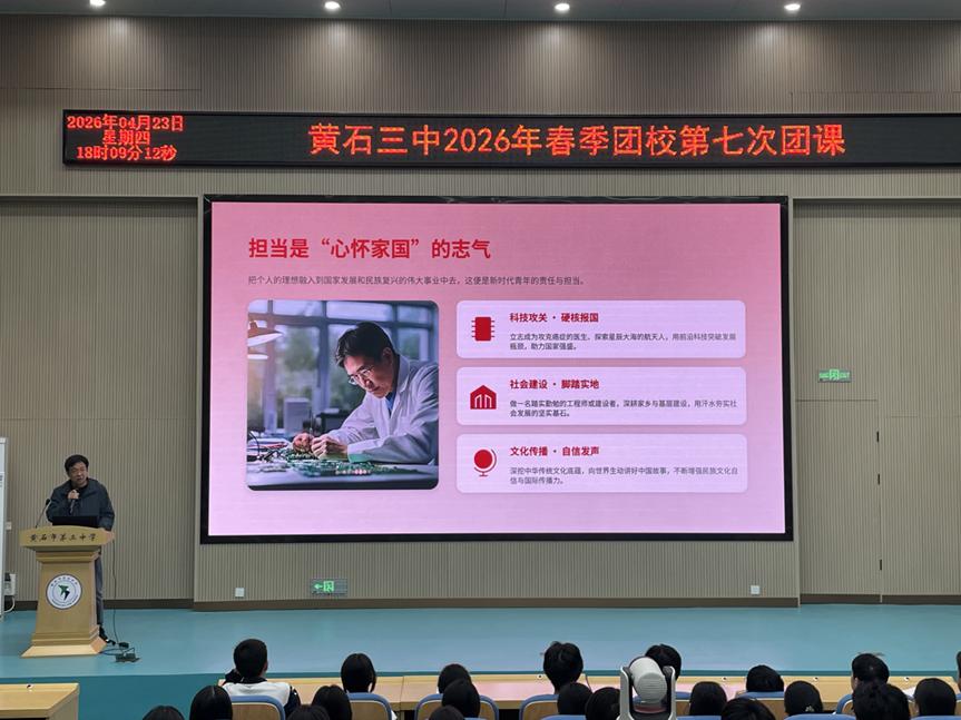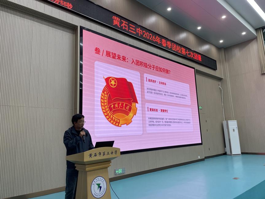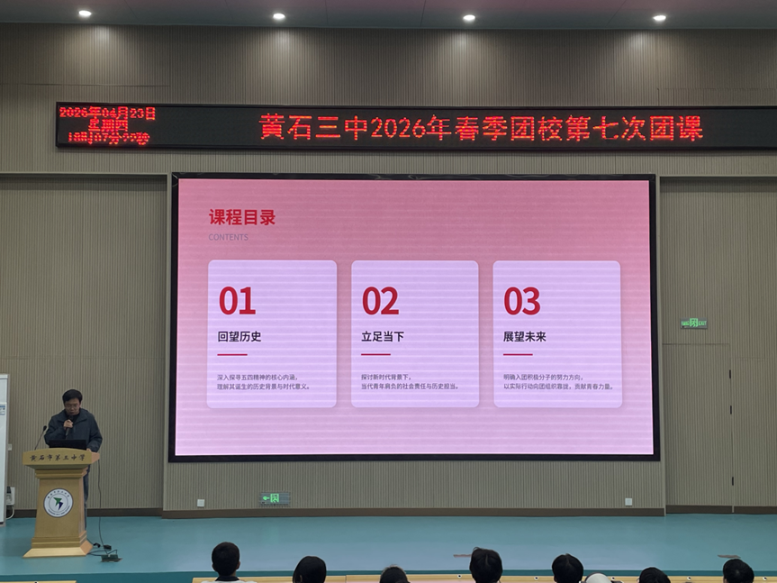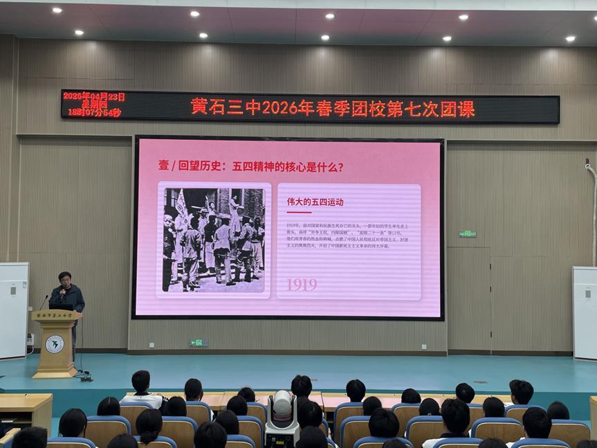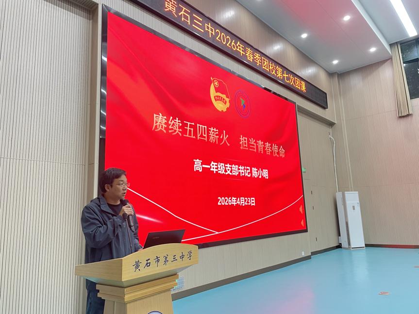 为纪念五四运动107周年,深入学习贯彻习近平总书记关于青年工作的重要思想,引导入团积极分子赓续红色血脉、勇担时代重任,2026年4月23日,黄石市第三中学2026年团校第七次团课在学校报告厅隆重举行。本次团课以“赓续五四薪火,担当青春使命”为主题,由高一年级党支部书记、政治教研组组长陈小明老师主讲,校团委刘成洪老师主持。全体入团积极分子齐聚一堂,在历史的回望中汲取精神力量,在时代的召唤下明确奋斗方向。