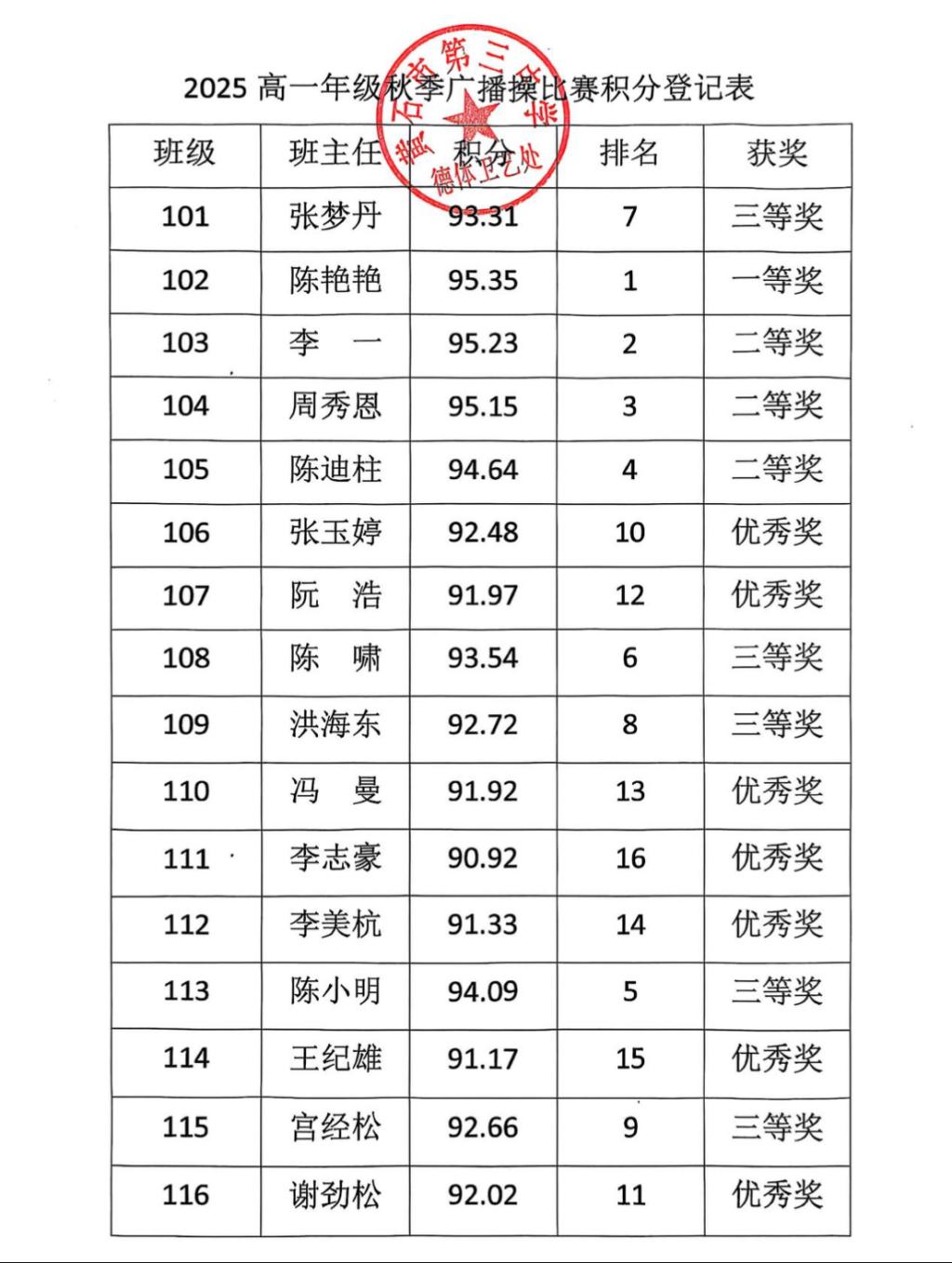 经过激烈的角逐,最终102班获一等奖;103班、104班、105班获二等奖;101班、108班、109班、113班、115班获三等奖;106班、107班、110班、111班、112班、114班、116班获优秀奖。学校领导为获奖班级颁奖。