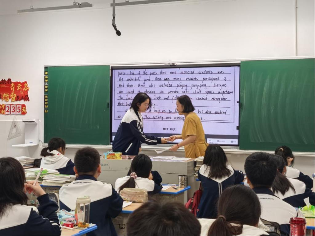 李老师本节课的高三习题评讲课分三部分:先聚焦高频错题,拆解考点并剖析易错点;再通过经典句型学习与仿写,为作文环节铺垫;最后讲解作文审题立意等要点,并指导学生完成变式作文写作。课堂以“错题复盘 — 能力衔接 — 写作实践” 为逻辑主线,三环节层层递进且各有亮点:针对高频错题,不仅解析考点与易错点,更引导学生总结同类题型的解题规律,复盘环节 “重方法、轻答案”,凸显举一反三的教学思路;经典句型教学环节,通过 “解析结构 — 范例赏析 — 即时仿写” 三步法,让学生快速掌握句型运用技巧,衔接过渡自然流畅;作文讲解环节,既覆盖审题立意、结构搭建等基础要点,又通过变式写作训练,推动学生将所学知识转化为实战能力,实现 “讲练结合” 的高效落地。