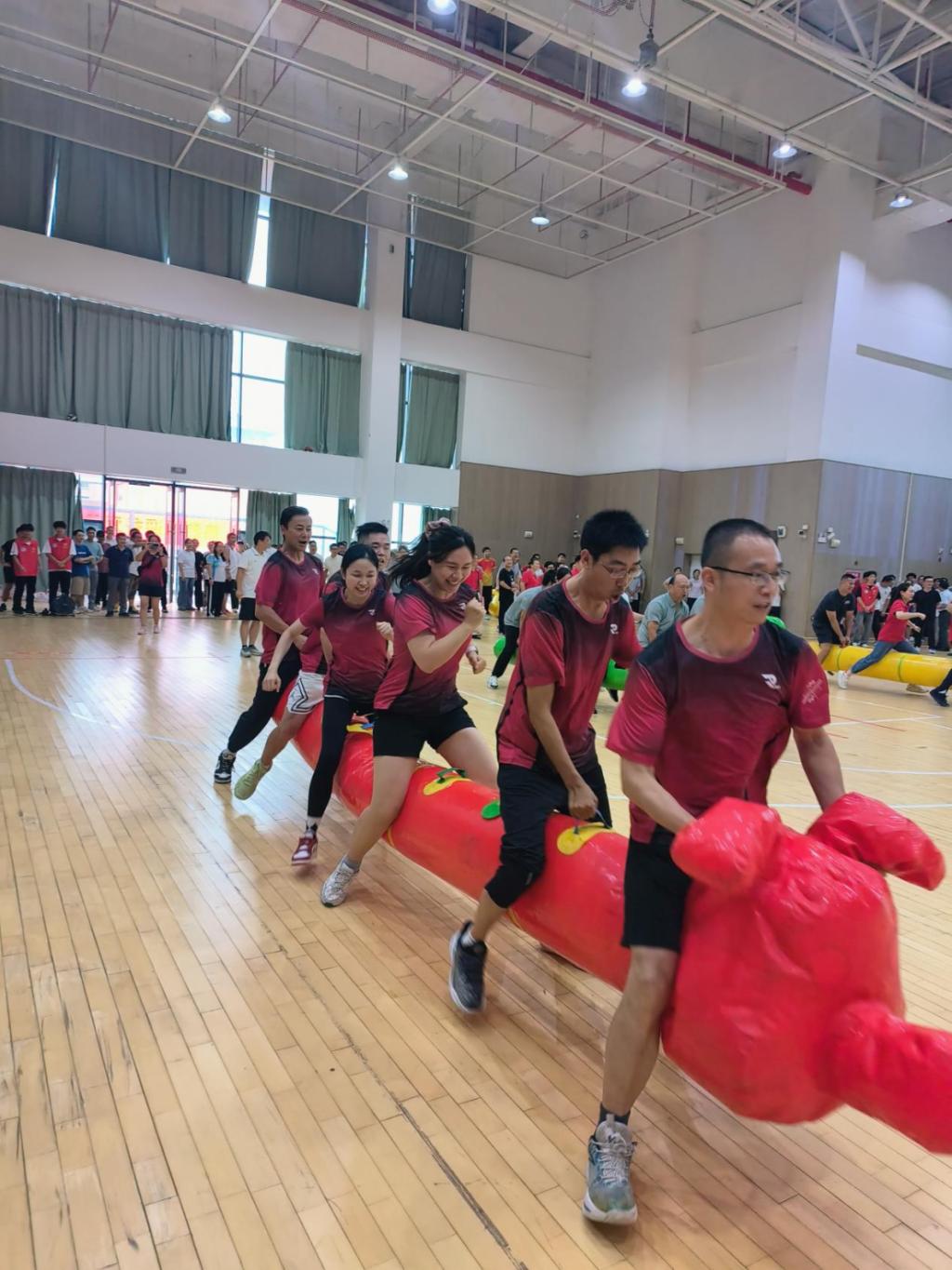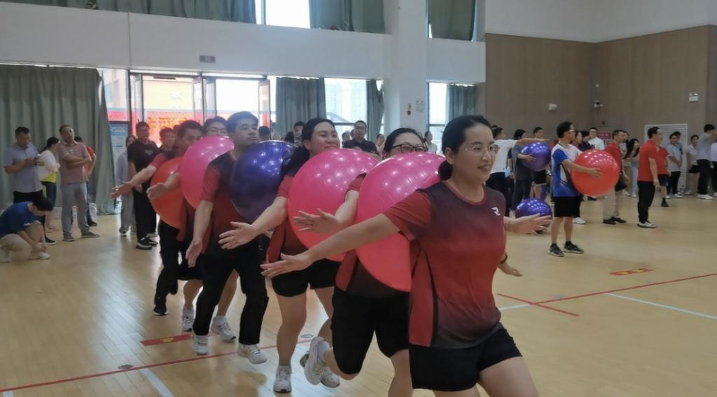 “预备——开始!”随着哨声响起,“萌虫竞速·同舟共济”项目率先开战。黄兴亮、代施建、姚聪、明方旭四位男教师稳稳抓住“萌虫”把手,李郡、徐笑两位女教师紧随其后,六人双脚步调一致,齐声喊出“一二、一二”的节奏。