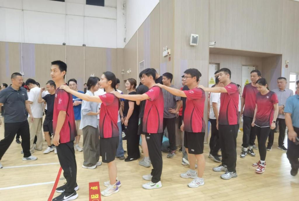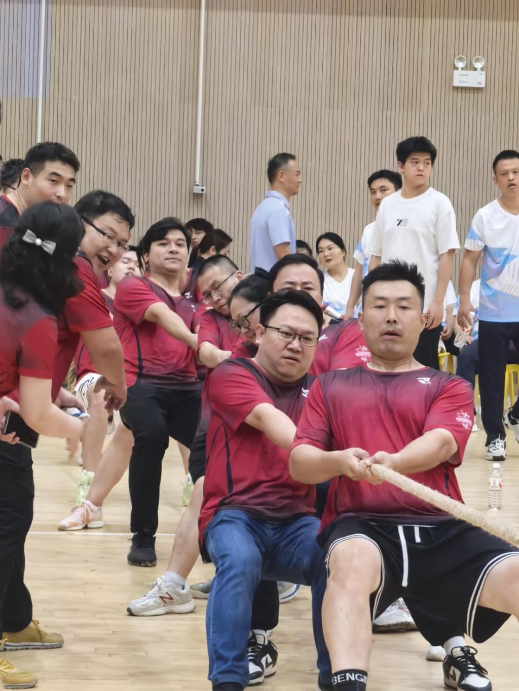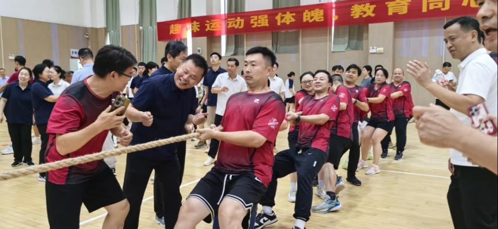 哨声一响,队员们瞬间扎稳马步,身体后倾,双手紧握绳索。校长杨昊作为核心牢牢稳住阵脚,董湘娥、冯莉两位女教师咬紧牙关、脸涨通红,力气丝毫不输男同胞。绳索上的红线来回拉锯,全场都在为他们呐喊——“加油!坚持住!”最终,伴随着一声整齐的“一二、一二!”,红线稳稳越过己方界线,胜利的欢呼响彻赛场!